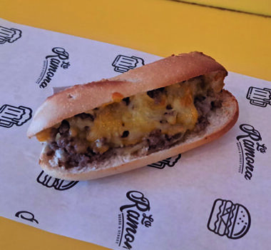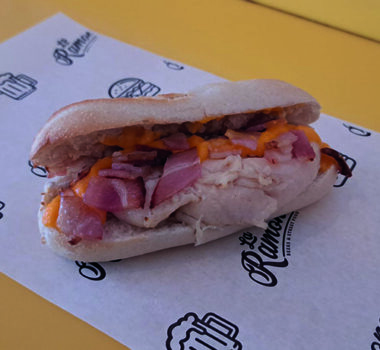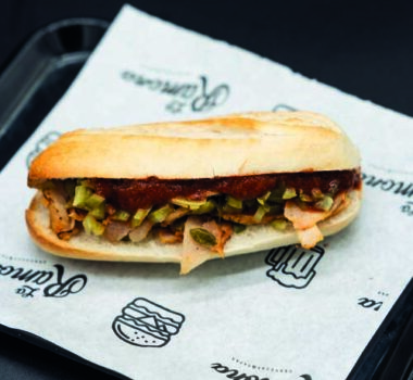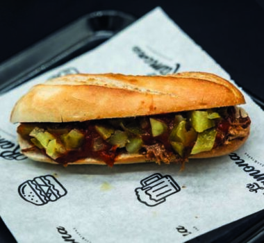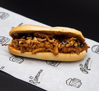 EL COCHINITO Pulled pork, queso ahumado, pepinillo, salsa Emmy Ramona y cebolla crujiente.